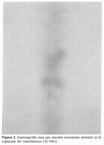 El abordaje de todo paciente con dolor de espalda y en quienes se sospecha de la presencia de fracturas vertebrales de origen osteoporótico o tumoral, inicia con las radiografías simples y sus hallazgos deben correlacionarse con una historia clínica y examen físico meticulosos, para correlacionar la localización del dolor con el nivel de la fractura y excluir la presencia de déficit neurológico focal o mielopatía. Al definir el segmento espinal afectado, referirlo como: columna cervical, columna torácica (T1T10), unión tóracolumbar (T11L2) y lumbar baja (L3L5 ) 22,29 . Se requiere de estudios con cortes transversales (imagen por resonancia magnética [IRM] y tomografía computada [TC]) para determinar si hay compromiso significativo del canal espinal y evaluar la integridad de la pared posterior del cuerpo vertebral, así como para excluir otras causas de dolor de espalda 12 . La IRM ayuda a determinar la evolución de la fractura: el edema del cuerpo vertebral (hipointensidad de la médula ósea en T1 e hiperintensidad en T2) es diagnóstico de fracturas agudas 30 (figura 1). La densitometría ósea y la gamagrafía ósea (figura 2) son otras herramientas diagnósticas; el encontrar actividad aumentada, parece tener valor predictivo de respuesta clínica favorable a la VP 2,19.