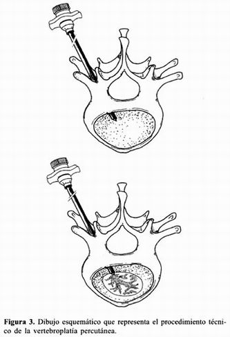 La vertebroplastía percutánea (VP) es un procedimiento de mínima invasión consistente en la inyección de un cemento acrílico (polimetilmetacrilato [PMMA]) dentro de la porción esponjosa de un cuerpo vertebral parcialmente colapsado que se realiza con el objeto de proporcionar alivio del dolor y prevenir el colapso vertebral y la seudoartrosis en pacientes con fracturas vertebrales osteoporóticas al incrementar la estabilidad mecánica. Se ha reportado que la VP produce efectos analgésicos y asiste en el fortalecimiento de los segmentos espinales debilitados cuando se utiliza en el manejo de fracturas vertebrales por compresión secundarias a osteoporosis, hemangiomas agresivos, mieloma múltiple focal espinal, quistes óseos aneurismáticos, linfomas, granulomas eosinofílicos, plasmocitomas y metástasis osteolíticas, así como en fracturas traumáticas 112.