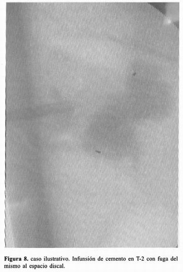 Debido al fracaso en el tratamiento médico, la paciente fue sometida a vertebroplastía percutánea utilizando un abordaje posterior transpedicular de dos niveles. Se inyectaron 4 ml de PMMA a través de un solo pedículo en T5 (figura 6) y 8 ml a través de ambos pedículos en T12 (figura 7). Las imágenes transoperatorias mostraron un llenado adecuado de ambos cuerpos vertebrales. En el cuerpo de T12 hubo fuga de PMMA hacia el espacio discal suprayacente (figura 8), que no tuvo significado clínico. Al concluir el procedimiento la paciente se mantiene en reposo absoluto por lapso de 2 horas e inicia bipedestación y deambulación 6 horas después. En el periodo posoperatorio inmediato la paciente mostró resolución total del dolor y es egresada del hospital al día siguiente sin déficit neurológico ni requerimientos de analgésicos. En el examen de seguimiento a dos y medio meses, la paciente se mantuvo libre de dolor dorsal. En esta fecha se presentó reactivación del proceso tumoral pulmonar, rápidamente progresivo y la paciente falleció 3 meses después de realizada la vertebroplastía percutánea.