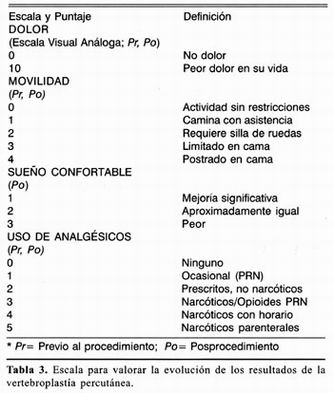 Para la evaluación del dolor causado por la fractura o por la involucración tumoral del cuerpo vertebral se utilizan diversas escalas, la más común es la escala visual análoga (EVA) y se consideran otros parámetros como la limitación en la movilización que condiciona el dolor, el uso de analgésicos y el grado de mejoría obtenido con el procedimiento 2,29,31 (tabla 3).