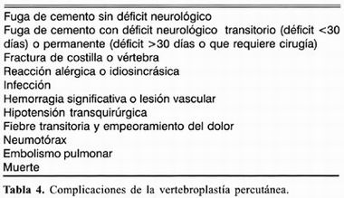 Las complicaciones significativas ocurren en menos del 3% de los pacientes tratados por fracturas por compresión secundarias a osteoporosis y en menos de 10% de los pacientes tratados por involucración neoplásica 13 . La mayoría de las complicaciones reportadas son menores y transitorias 33 (tabla 4).