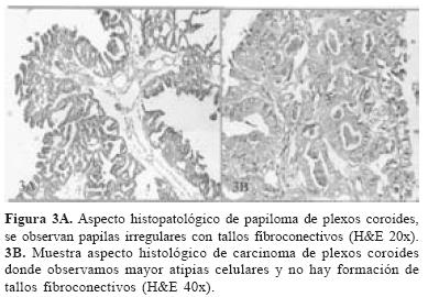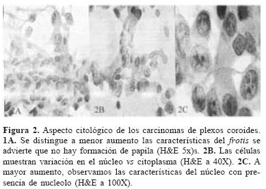 El carcinoma de plexos coroides muestra células con núcleo grande, hipercromatico con cromatina densa16, anisocitosis de bordes irregulares y con escaso citoplasma, con nucléolo pequeño. Hay variación en el tamaño y en las formas de las células, el fondo es sucio hemorrágico de aspecto necrótico y en nuestros dos casos no presentaron estructuras papilares ni estructuras vasculares.
