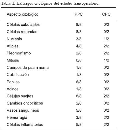El aspecto citológico en el estudio transoperatorio en los papilomas de plexos coroides al igual que otros tumores cerebrales es el método más útil y característico para el diagnóstico. En el estudio transoperatorio, observamos un frotis muy celular, cohesivo, homogéneo: con formación de papilas, o células en forma silueta, aislada sin actividad mitótica, puede haber anisonucleosis, tamaño variable de las células, en el fondo se observa material fibrilar. Estudiamos una pequeña serie de 10 casos de tumores de plexos coroides, detectados mediante tomografía axial computada, 5 estaban localizados en el IV ventrículo, 3 en el III ventrículo y 2 en el ángulo pontocerebeloso, 8 fueron papilomas y 2 carcinomas. Se obtuvo el material para estudio transoperatorio, el cual se tino con hematoxilina y eosina. El diagnóstico de papiloma de plexos coroides puede sugerirse por TC pero es difícil el estudio transoperatorio y el diagnóstico definitivo se hace mediante el estudio histológico. El diagnóstico se debe hacer con las neoplasias epiteliales papilares primarias o metastásicas.