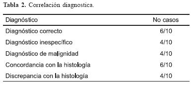 La correlación citológica con el estudio histopatológico se realizó en 6 pacientes, 2 casos se diagnosticaron como metástasis de carcinomas papilar. No hubo diferencias entre citológicas edad, género, localización ni sintomatología (la tabla 2 muestra resultados de la correlación diagnóstica).