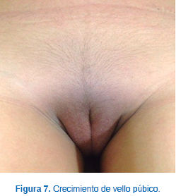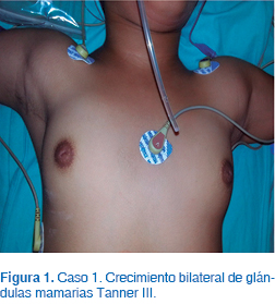 Femenina de seis años de edad que acudió al Servicio de Urgencias por sangrado transvaginal, acompañada de crecimiento de glándulas mamarias y la presencia de vello púbico. A la exploración física, tuvo un peso de 20 kg y talla de 119 cm, con la presencia de crecimiento bilateral de glándulas mamarias Tanner III (Figura 1), sin adenomegalias. El abdomen se encontró blando depresible y se detectó una masa abdominal palpable móvil, de consistencia renitente, de aproximadamente 7 x 8 cm, no adherida a planos profundos (Figura 2). El resto de la exploración, normal.