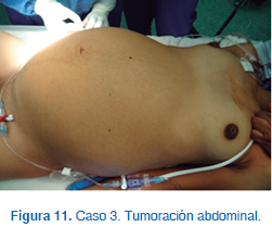 A la exploración física, tenía un peso de 26 kg, talla de 138 cm, crecimiento de ambas glándulas mamarias Tanner II, galactorrea, abdomen blando depresible con tumor abdominal móvil (Figura 11), vello púbico y resto de la exploración normal.