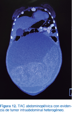 La TAC abdominopélvica evidenció un tumor intraabdominal heterogéneo (sólido y quístico) con densidades de 12 y 54 UH, sin calcificaciones, de 29 x 24 x 12 cm y peso de 4.61 kg (Figura 12). Los estudios de laboratorio mostraron alfa fetoproteína de 1.8 μg/L, fracción β de la gonadotrofina coriónica de 1.2 mUI/mL; LH, 6 mUI/mL; FSH, 7 mUI/mL; prolactina, 1,230 ng/mL (valor normal de referencia 0-20 ng/mL); estradiol, 2.1 pg/mL, y 17-OH PROG, 0.5 ng/dL.