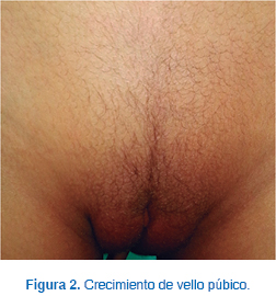 El reporte de patología informó el hallazgo de un tumor de células de la granulosa de ovario izquierdo, sin lesión residual y biopsias negativas. La paciente evolucionó satisfactoriamente, con involución de los caracteres sexuales secundarios en un lapso de dos meses. El perfil hormonal final se encontró dentro de parámetros normales.