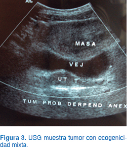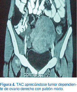 Se realizó USG, encontrándose un tumor con ecogenicidad mixta (Figura 3). La TAC mostró un tumor dependiente de ovario derecho con dimensiones de 6 x 9 x 9 cm de diámetro, con patrón mixto (Figura 4). Se realizó la determinación de alfa fetoproteína, con resultado de 2 μg/L; la fracción β de la gonadotrofina coriónica fue de 1 mUI/mL; la hormona luteinizante (LH), de 6 mUI/mL; la hormona folículo estimulante (FSH) fue de 7.2 mUI/mL; prolactina, 15.9 ng/mL; estradiol, 2.6 pg/mL, y la 17-OH PROG (17-hidroxiprogesterona), de 0.5 ng/dL.