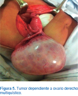 Se decidió realizar resección quirúrgica, encontrando tumor dependiente de ovario derecho multiquístico (Figura 5). Se efectuó protocolo para tumores de ovario, con toma de muestras de líquido peritoneal, peritoneo anterior, epiplón y peritoneo adosado al diafragma. No se obtuvo muestra de ovario contralateral por no apreciar lesión macroscópica; no se efectuó biopsia de ganglios por no existir evidencia de lesión. Se realizó salpingooforectomía derecha.