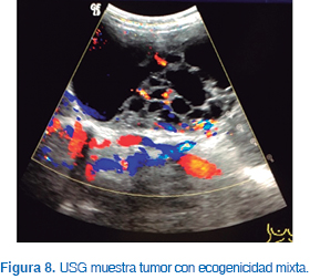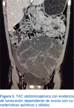Se inició protocolo de estudio. El USG mostró tumor con ecogenicidad mixta (Figura 8); la TAC abdominopélvica evidenció una masa dependiente de ovario con características mixtas, quísticas y sólidas de 15 x 20 cm de diámetro (Figura 9). Los estudios de laboratorio indicaron alfa fetoproteína de 1.6 μg/L, fracción β de la gonadotrofina coriónica de 1.4 mUI/mL; LH, 6.2 mUI/mL; FSH, 7.4 mUI/mL; prolactina, 16.3 ng/mL; estradiol, 2.1 pg/mL, y 17-OH PROG, 0.6 ng/dL.
