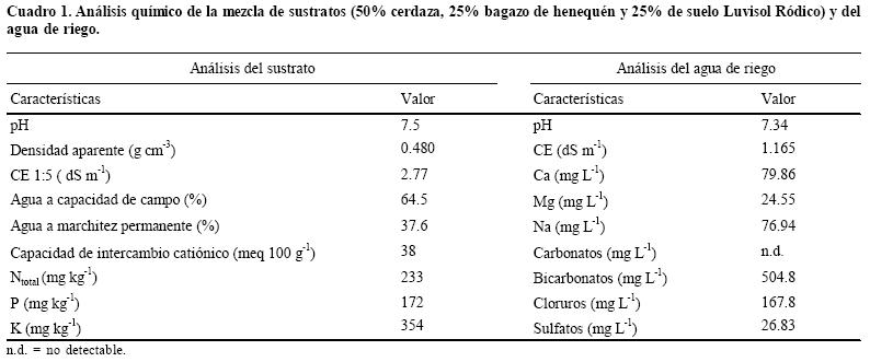 Plantas de chile habanero de 3035 días de desarrollo fueron cultivadas en invernadero en bolsas negras de 12 kg utilizando una mezcla de sustratos formada con 50% cerdaza, 25% bagazo de henequén y 25% suelo Luvisol Ródico, cuyo análisis de caracterización y del agua de riego empleada se muestran en el Cuadro 1. El trasplante se realizó el 5 de noviembre de 2001, la distancia entre plantas fue de 46 cm y entre hileras fue de 2 m. El área experimental ocupó una superficie de 198 m2. Considerando las recomendaciones de diferentes autores para la producción de chile habanero (INIFAP, 1997; Tun, 2001; Soria et al., 2002), las cuales se encuentran en un rango de 95 a 250 kg ha1 de NPK, se evaluaron tres niveles de fertilización de N, P2O5 y K2O: 000000000, 120120120 y 240240240 y tres niveles de humedad aprovechable (HA): 100, 75 y 50% en un diseño completamente al azar con arreglo factorial 32 para hacer un total de 9 tratamientos. Cada tratamiento tuvo cuatro repeticiones y cada repetición tres plantas para un total de 108 plantas en estudio. La fertilización se realizó manualmente, disolviendo el fertilizante en 12 L de agua recibiendo cada planta 250 mL de la solución. Considerando la demanda nutrimental del cultivo (Tun, 2001), la fertilización se realizó cada 7 días y posteriormente cada 4 días, a partir del amarre y llenado de fruto. La lámina de riego por aplicar para cada nivel de HA se obtuvo a partir de la curva de retención de humedad y de acuerdo a la ecuación: