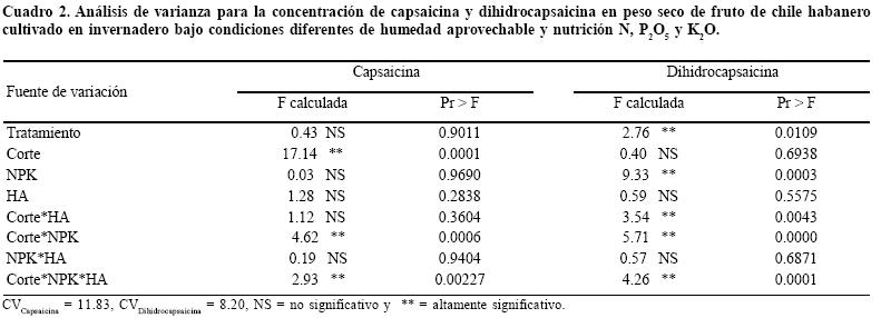 Los niveles nutrimentales y de humedad aprovechable no tuvieron un efecto estadísticamente significativo sobre la concentración de capsaicina y dihidrocapsaicina en los frutos de chile habanero, cuando se esperaba que los alcaloides se concentraran al disminuir la nutrición y humedad en el suelo.