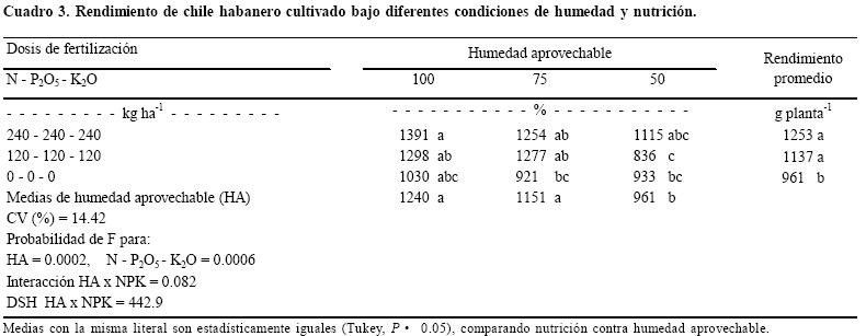 El mayor rendimiento de fruto de 1391 g planta1 se presentó con la dosis más alta de fertilizante y el 100% de humedad aprovechable.