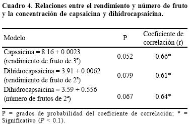 La relación entre la calidad de fruto y el número de frutos producidos por planta sobre la concentración de CAP y DHCAP se muestra en el Cuadro 4. Únicamente se encontró diferencia significativa entre el contenido de CAP y la producción de fruto clasificado de tercera y el contenido de DHCAP y la producción de fruto de segunda. En cuanto a la relación existente entre los alcaloides y el número de frutos producidos por planta únicamente se tuvo relación entre el contenido de DHCAP y la producción de frutos de segunda. De acuerdo a CázaresSánchez et al. (2005) existe la tendencia de que los frutos cuando son grandes y de mesocarpio grueso piquen poco, como es el caso del C. annum, mientras que los frutos pequeños con mesocarpio delgado tengan mayor concentración de capsaicinoide. Esto coincide con las experiencias de los productores de chile habanero de Yucatán, ya que consideran que los frutos de chile habanero pequeños son más picosos y es probable que de acuerdo a lo señalado por CázaresSánchez et al. (2005) a ello se deba que los frutos clasificados como de primera no presenten correlación con las concentraciones de CAP y DHCAP.