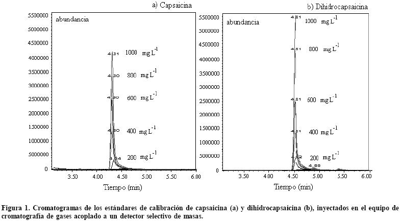 Para la identificación de capsaicina (CAP) y dihidrocapsaicina (DHCAP) se utilizó un cromatógrafo de gases (GC/MS) marca Agilent Technologies modelo 6890N acoplado con un detector selectivo de masas (MS) modelo 5973 Network, con una columna capilar SUPELCO modelo SPBTM1701 de silicón fundido, con una longitud de 30 m x 0.25 mm x 0.25 mm en grosor de la película de la fase estacionaria y de polaridad intermedia. Las condiciones del horno consistieron en: una temperatura inicial de 250 oC por minuto, posteriormente dos rampas siendo la primera de 1 oC por minuto hasta alcanzar los 255 oC y la segunda fue programada a 10 oC por minuto pero hasta alcanzar únicamente los 260 oC, dando un tiempo de corrida de 7.5 min con un flujo constante de helio en columna de 1.8 mL min1. El tiempo de equilibrio del CG/MS fue de 2 min y el modo de inyección fue sin división. Se realizaron de tres a cuatro inyecciones por muestra para obtener un promedio de áreas semejantes.