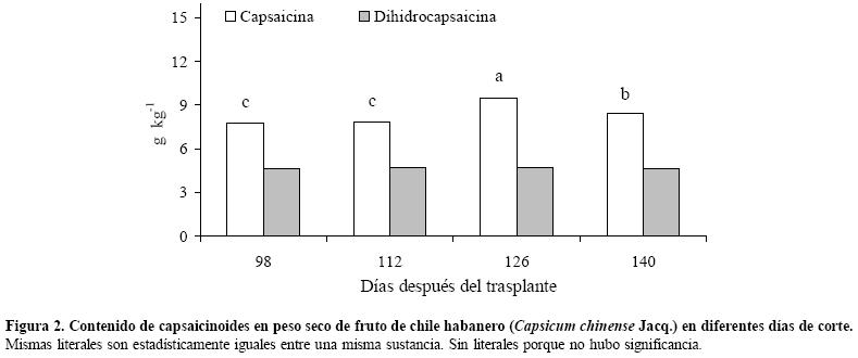 Únicamente para capsaicina su contenido aumentó con la edad de la planta al tener ésta 126 días de desarrollo, posteriormente baja de 9.5 a 8.5 g kg1 de fruto seco a los 140 días de desarrollo.