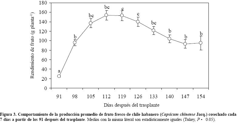 Los rendimientos alcanzados mostraron la importancia de la aplicación al suelo de dosis altas de N, P2O5 y K2O y de la suficiente disponibilidad de agua en la solución del suelo para esta especie (Cuadro 3). Resultados similares fueron reportados por Wierenga y Hendrickx (1985) con chiles rojos y verdes; Pire y Colmenarez (1994) con pimentón y por Jaimez (2000) con C. chinense dulce; quienes señalan que el rendimiento disminuye a medida que la nutrición o la humedad aprovechable se reduce, esto como una respuesta fisiológica detrimental ante condiciones hídricas y nutrimentales estresantes, indicando este último que la traslocación de asimilados hacia los frutos disminuye a medida que aumenta el déficit de agua. El rendimiento de fruto tuvo una respuesta significativa con el número de corte. La mayor producción de fruto promedio se tuvo a los 112 y 119 días después del trasplante respectivamente con una producción media de 153 g de fruto por planta; posteriormente la producción de fruto decae hasta 93 g de fruto por planta a los 147 días después del trasplante (Figura 3).