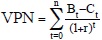 dónde: VPN es el valor presente neto ($); Bt son los beneficios totales en el año t ($); Ct son los costos totales en el año t ($); Bt - Ct es el flujo neto en el año t ($); n es el número de años del horizonte de evaluación; r es la tasa social de descuento; y t es el año calendario, en donde el año 0 será el inicio de las erogaciones.