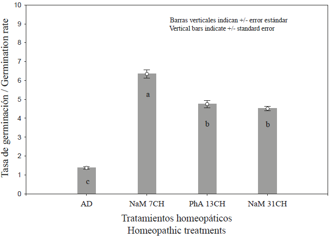 In relation to the effect of homeopathic medicines in germination rate, a significant difference was found (P = 0.0000) among the homeopathic treatments applied, of which NaM-7CH stood out as the one with greater TG (Figure 2), which made a positive effect evident in germination speed of S. bigelovii seeds treated with NaM-7CH. This finding can also be associated to the presence of nanoparticles of the active ingredient that have the capacity of stimulating germination efficiently, increasing speed significantly with this physiological process (Mazón-Suástegui et al., 2019). The treatments with PhA-13CH and NaM-31CH, also favored the germination rate although in lesser proportion; however, it is convenient to highlight that the three homeopathic treatments applied stimulated the germination rate of S. bigelovii when compared with the control treatment (Figure 2).