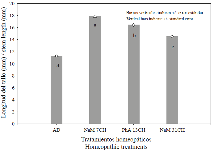 When stem length (LT) was analyzed, a significant difference of this variable could be observed with respect to the homeopathic treatments applied (P = 0.000), noticing again a greater response in plants treated with NaM-7CH (Figure 3). With this homeopathic medicine, it was possible to increase LT in 63.6% with respect to the control treatment (DW), such as with the other response variables, all treatments stimulated growth in LT compared with the control but in a lesser percentage to NaM-7CH (PhA-13CH, 45% and NaM-31CH, 27.2%).