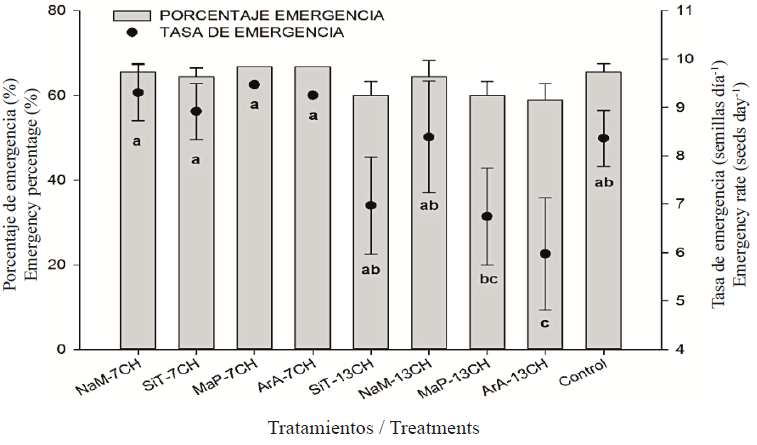 With respect to emergence percentage, significant differences were recorded between treatments and the control group, mainly in the emergence rate (Figure 2), and higher values (9.47 and 9.25 seeds per day, respectively) were recorded with treatment MaP, compared with the control group (8.3 seeds per day).