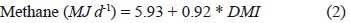 where CL = level of feeding, Em = net energy for maintenance, El = net energy for lactation, Eg= net energy for growth, Ec= net energy for pregnancy, and km,l,g,c = efficiency of utilization of ME for the different functions mentioned before. The ISM was implemented in ModelMaker version 3.0.3 (Cherwell Scientific, 1997). The model predicts CH4 in MJ d-1 and in g d-1, and converts to volume and mass values using the factors 0.0253 l/kJ and 0.716 g/L, respectively, as derived from Brouwer (1965). The methane conversion rate (MCR) was calculated as follows: MCR (%GE intake) = (CH4 MJ d-1 * 100)/GE intake MJ d-1, where GE is the gross energy intake in MJ d-1.