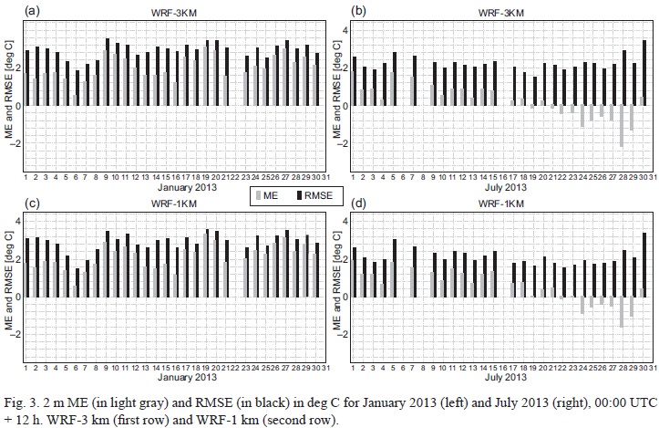 Daily ME and RMSE values were computed for WRF-3 km and WRF-1 km for the same forecast times mentioned above and are represented in Figs. 2-7 (3, 4, 5, 6). For 2 m temperature, slightly smaller daily error values can be noticed for WRF-3 km compared to WRF-1 km for most of January 2013. However, smaller amplitude of errors is generally obtained from WRF-1 km for this period. Again, the tendency of the model to overestimate forecast values compared to observations is obvious for January 2013 for all analyzed forecast times (Figs. 2-4).