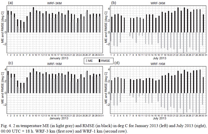 For the first part of the same period, the values of these scores computed for the 00:00 UTC + 12 h forecast time also show the same tendency to overestimate forecasted values of 2 m temperature compared to observations taking into account the WRF model integrated at both horizontal resolutions (Fig. 3). The analysis of ME and RMSE values for the same forecast time (00:00 UTC + 12 h) for the second part of July 2013, shows that WRF-1 km and especially WRF-3 km tend to underestimate forecasted values of this parameter in comparison to the observations from the meteorological sites (Fig. 3).