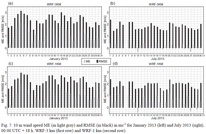 The general tendency of the WRF model to overestimate forecast values at both resolutions (3 and 1 km) for 2 m temperature and 10 m wind speed in comparison with observations is also shown by the ME values for the two analyzed periods (Table I). As can be seen from ME values for 2 m temperature, the general tendency of both experiments (WRF-3 km and WRF-1 km) is to overestimate the forecasted values of this parameter in comparison with observations for the winter period analyzed. The same tendency can be noticed for the summer period for the 00:00 UTC + 6 h and for the 00:00 UTC + 12 h forecast. For the 00:00 UTC + 18 h forecast for the summer month, both models seemed to underestimate the values of the parameter in comparison with observations. For both months, differences in ME values between WRF-3 km and WRF-1 km vary between -0.06 deg C (for January 2013, 00:00 UTC + 6 h and 00:00 UTC + 12 h) and 0.29 deg C (July 2013, 00:00 UTC + 6 h and 00:00 UTC + 12 h). Despite the high values of RMSE for both months, errors of smaller amplitude can be noticed for WRF-1 km than for WRF-3 km for most of the analyzed period.