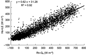 Energy balance closure was evaluated using three different methods. The first method was to derive linear regression coefficients (slope and intercept) from the OLS relationship between the half-hourly estimates of the dependent flux variables (LE + Hs) against the independently derived available energy (Rn - G) (Wohlfahrt and Widmoser, 2013), which can be expressed as: