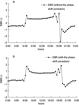 Fig. 8 Diurnal variation of EBR during the rice cultivation season, 2013. (a) Without phase shift correction. (b) With phase shift correction.