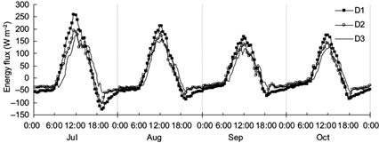 Fig. 9 Monthly averaged diurnal variations of D1 , D2 and D3 during the rice cultivation season in 2013. D1 is the energy balance residual without any correction, D2 is the energy balance residual without the forward phase shift but considering the change in soil heat storage, and D3 is the energy balance residual considering the change in soil heat storage as well as the forward phase shift.