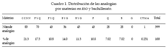 En los libros de texto del segundo ciclo de la ESO se emplean con mayor frecuencia las analogías en las materias de física y química (17.5%) que en las de biología y geología (14.0%). Esto debido a que los textos de física y química presentan contenidos más complejos, difíciles y abstractos (como los de electricidad y química) y, por lo tanto, más proclives a recibir tratamiento analógico.