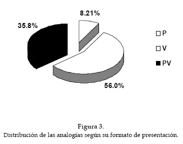 Más de la mitad de las analogías que se han identificado en los textos (56.0%) se encuentran en formato verbal. Por lo tanto, se concede poca importancia a las imágenes analógicas en los libros de texto (ver figura 3).