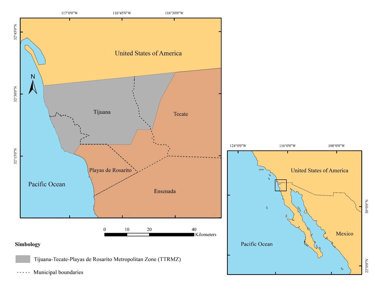 Recognized in 2004 as a geographic, economic and social unit, to jointly plan and regulate the development (Gobierno del Estado de Baja California, 2004, p. 16), the ZMTTR is located to the northwest of Baja California, Mexico. It shares borders to the north with the United States (USA), it adjoins to the West with the Pacific Ocean, and covers 139 864.44 ha (1.68% of the state) (Venegas & Rojas, 2009). It is comprised by three municipalities: Tijuana, Tecate and Playas de Rosarito (Rosarito) (Figure 1).