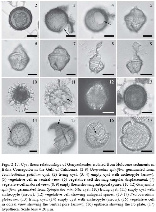 The germination assays let us demonstrate heterospory in the resting stage of Gonyaulax spinifera from Bahía Concepción because more than one cyst was attributed to this species. However, it is clear that an accurate taxonomic revision involving scanning electron microscopy, molecular biology, and life cycle studies are required (see Matsuoka et al., 2006). Because of socalled heterospory, the resting stage of G. spinifera has received several paleontological names, including Spiniferites mirabilis, Tectatodinium pellitum, Nematosphaeropsis labyrinthus, Bitectatodinium tepikiense. Even more cysts with other paleontological names are related with the G. spinifera complex as a biological affinity (Head, 1996; Rochon et al., 1999). However, the names cannot be synonymous because the taxa produce morphologically different types of cysts that most likely correspond to different species of the G. spinifera complex (Martin J. Head, pers. comm., February 2007). Ellegaard et al. (2003) demonstrated that motile stages obtained from germinating several Spiniferites cysts and B. tepikiense, which were previously attributed to the G. spinifera complex, belong to distinct species of the genus Gonyaulax, which in the motile stage, show small morphological differences, but relatively high genetic divergence.