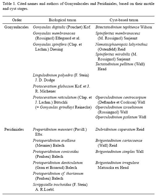 There are 1555 marine dinoflagellates species living today (Gómez, 2005) and at least 180 of them produce organicwalled resting cysts (Head, 1996). The main morphological characteristics used to identify dinoflagellate cysts are the general morphology of the body and ornamentation, structure and color of the wall, and archeopyle type (Matsuoka & Fukuyo, 2000). In most cases the archeopyle is essential to discriminate between major taxa of dinoflagellates. However, living cyst archeopyles are hard to see under light microscopy before germination, so it is difficut to use this character to identify morphotypes, particularly from the Gonyaulacales and Peridiniales because of their complex and very similar morphology. For example, in the Gonyaulacales, heterospory led taxonomists to propose groups or species complexes (Dale, 1983; Lewis et al., 1999). Whether the motile stages have been underclassified or cysts overclassified, is under discussion (Taylor & Gaines, 1989; Ellegaard et al., 2003). The cysts of Protoperidinium Bergh and the Diplopsalioideae are dominant heterotrophic groups in extant dinoflagellate benthic assemblages. However, most of their cysts are spherical and have a simple external morphology. Therefore, they are very difficult to identify, except for the archeopyle shape and position, and no information on tabulation can be inferred (Matsuoka et al., 2006).