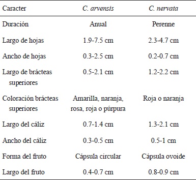 C. nervata puede ser confundida en el campo con C. arvensis (Fig. 2), muy similar debido a la presencia de hojas linear-lanceoladas, corolas inconspicuas y brácteas superiores teñidas de color rojo (Cuadro 1).