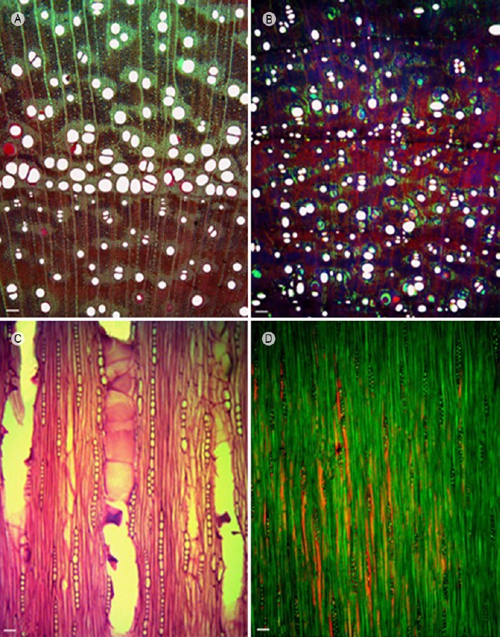Figura 1 Cortes anatómicos de la madera de Mimosa aculeaticarpa Ortega var. aculeaticarpa y Mimosa luisana Brandegee. A. y C. M. aculeaticarpa; B. y D. M. luisana; A. B. cortes transversales; C. D. cortes tangenciales. Escala: 100 µm.