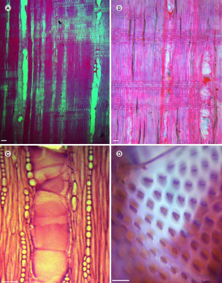 Para la observación de las características anatómicas se cortaron cubos de 1 × 1 cm, los cuales fueron ablandados durante 3 h a reflujo en agua destilada, tiempo necesario para poder seccionar la madera. Posteriormente, con un micrótomo de deslizamiento (American Optical 860, New York, EUA) se cortaron secciones transversales, tangenciales y radiales, con grosor de 20 µm, las cuales se tiñeron con safranina-verde rápido y se montaron en resina sintética (Johansen, 1940).
