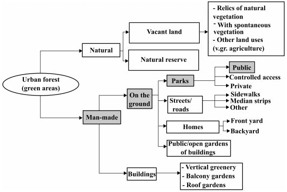 Urban forests consist of trees, shrubs and associated herbaceous vegetation located within the boundaries of a city. It also includes lines of trees on sidewalks and median strips in streets and avenues, and in general, any type of assemblage of plants ( Benavides-Meza & Fernández-Grandizo, 2012 ) (graph 1). Together with streams and other water bodies, urban forests comprise what is known as the urban ecosystem or, as Bolund and Hunhammar (1999) put it, the green and blue spaces located within the urban area.