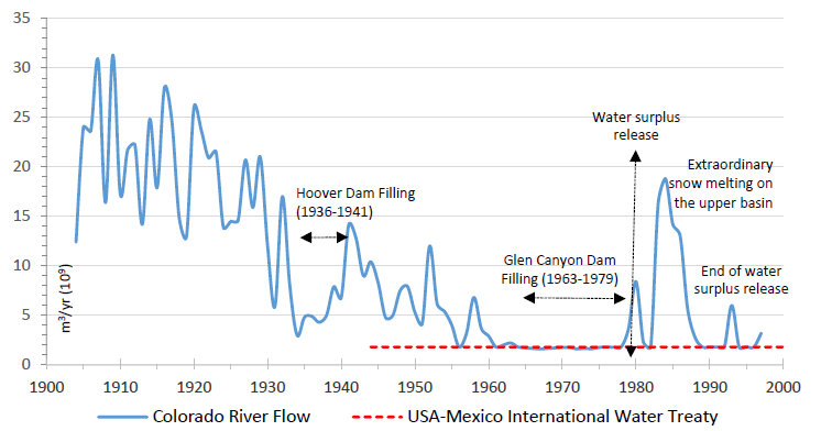 The volume of water from the Colorado River that entered the estuary in the UGC has been drastically reduced, since at the beginning of the last century the flow of the river on the US-Mexico border has decreased from 21,370x106 m3/year-1 in the period prior to the construction of the Hoover Dam to low values of 1780x106 m3/year-1 during the filling period of the Hoover Dam in 1935-1941 and the Glen Canyon Dam in 1963-1979 ( Fradkin, 1996 ; Samaniego, 2008 ). In the 1944 International Water Treaty between Mexico and the United States of America, the volume was limited to occasional flows due to surpluses of 1,850 x 106 m3/year-1 ( graph 1 ), which represents 9.09 % of the total average river flow, while California gets 26.6 % and Colorado 23.3 % ( Cortez Lara, 1999 ).