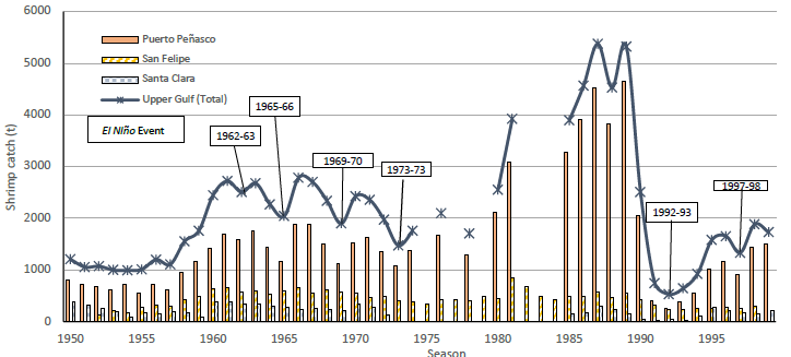 In analyzing the shrimp catch performance in a period without freshwater input from the river (1960-1979), increases in shrimp catch were observed two years after El Niño (ENSO) events from 1962-1963, 1965-1966, 1969-1970, 1972-1973 and 1997-1998, it is then likely that these increases are linked to freshwater input to the estuary due to high rainfall brought by the ENSO events and described by Pavía and Badán (1998) . The biological response on the freshwater input from the rivers and ENSO events has also been applied in other places ( Childers, Day Jr., & Muller, 1990 ; Del Valle & Martin, 1995 ; Mann & Lazier, 1996 ; Bect, 2000 ), which strengthened this study’s hypothesis on the paramount importance of the Colorado River and the ENSO events on recruiting for shrimp farming and shrimp survival on its early stages, for them to be part of the adult shrimp population available for fishery.