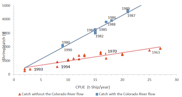 Freshwater flow restrictions from the Colorado River to the delta in the Gulf of California were shown to impact shrimp catch volumes. With the stimulus produced by the freshwater input to the Colorado River estuary, the shrimp catch disembarked in the UGC more than doubled in the 1979-1988 period.