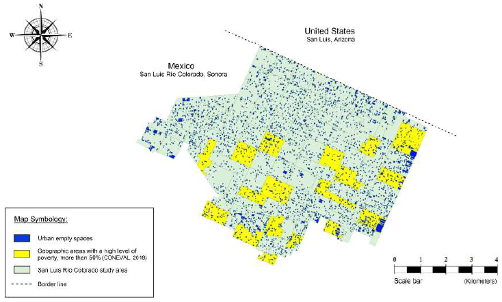 The present article has as a goal to provide some questions regarding the aforementioned urban geography with answers. In particular, the methodologic design tried to address the hypothesis stated in relation to ascertain whether the poverty ranges of the population can be considered a (qualitatively and spatially) factor linked to the number of empty urban places located in the following cities: Mexicali, Baja California; Nuevo Laredo, in Tamaulipas; and San Luis Río Colorado, Sonora, all of them in Mexico.