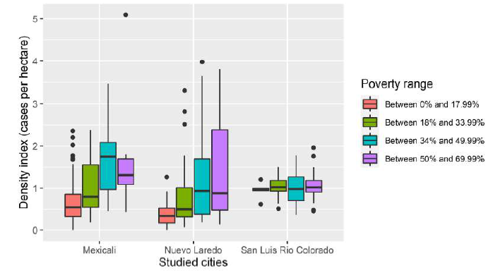 To ascertain if the increments observed in graphs 1 and 2 are statistically significant at individual and global level per city, the information was analyzed by means of a nonparametric test called Kruskall-Wallis. As a result of the application of this test, the values exposed in table 3 were obtained. In this table, it is noticed there is a difference between the density index per poverty range for Mexicali and Nuevo Laredo and the global average of the three cities. However, this was not the case for San Luis Río Colorado.