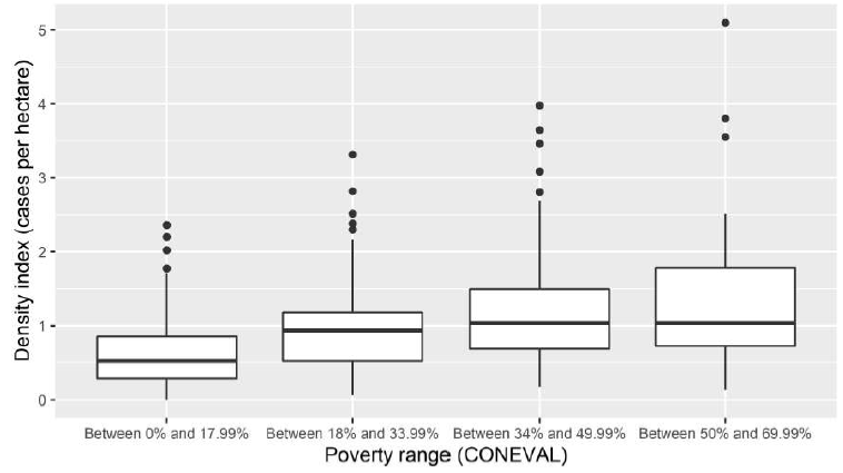 Taking the information above as a basis, it was possible to generate two graphs where the dispersion and symmetry of the obtained results is described. In graph 1, a comparison between density and empty urban spaces indexes (considering BGA as a measurement unit) contrasted against the poverty ranges defined by CONEVAL (2018) is observed. Such analysis is individually exposed for each of the three areas of study.