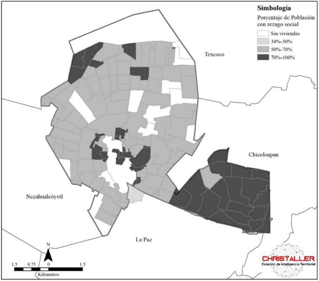 A escala de AGEB11 (Área Geoestadística Básica) se observa la homogeneidad territorial de la pobreza en el municipio. De acuerdo con los datos reportados por el Consejo Nacional de Evaluación de la Política de Desarrollo Social (Coneval) en el año 2015, 123 de los 137 AGEB del municipio registraban más de 50 por ciento de su población en condiciones de rezago social,12 y en las mismas condiciones se identificó, de los 40 AGEB, el 70 por ciento de su población (Coneval, 2015) (mapa 2).