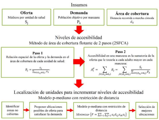 El proceso de cálculo se describe a continuación. Detallando tanto el cálculo del nivel de accesibilidad –a través del Método de Área de Cobertura Flotante de dos pasos (2SFCA)– para identificar la cobertura del servicio en la zona de estudio, como la aplicación del Modelo P-Mediano con restricción de distancia para evaluar propuestas de nuevas unidades médicas en zonas no cubiertas (figura 1).
